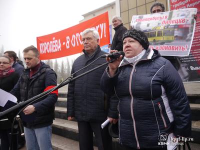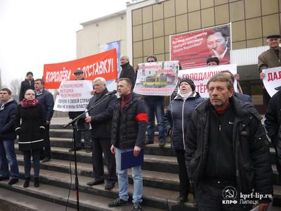 На митинге выступили первый секретарь Липецкого ГК КПРФ, депутат Липецкого облсовета Анатолий Сиротин, дальнобойщик, коммунист Геннадий Платонов, председатель первичной организации профсоюза работников пассажирского автотранспорта Татьяна Вострикова, активист общественной организации из Данкова «Мы и Власть» Пётр Алымов, комсомолка Евгения Платонова, дальнобойщик Андрей Новиков, предприниматель Наталья Сычёва, депутаты Липецкого облсовета Татьяна Копылова и Сергей Токарев, руководитель фракции КПРФ в облсовете, первый секретарь Липецкого ОК КПРФ Н.В. Разворотнев.