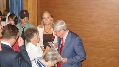 После слово было предоставлено министру образования Крыма с 2006 по 2009 годы, члену бюро Крымского рескома КПРФ, уроженцу Пензенской области Валерию Лаврову. Он выразил большую благодарность всем тем, кто поддерживал и продолжает поддерживать Крым. Особенно Валерий Васильевич благодарил жителей Пензы, которые выходили на митинги в поддержку народа Крыма. Население чувствовало эту поддержку! Он отметил, что и крымчане выходили на митинги с российскими флагами. «На одном из флагов мы ручкой написали «Пенза», - сказал Лавров. Он вручил первому секретарю Пензенского обкома КПРФ Георгию Камневу почетный знак с гербом республики, инкрустированный драгоценными камнями.