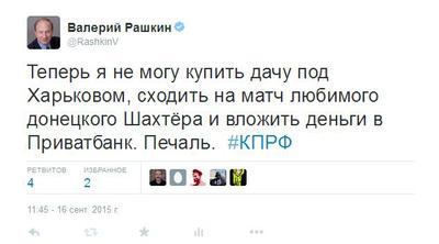 «Теперь я не могу купить дачу под Харьковом, сходить на матч любимого донецкого Шахтёра и вложить деньги в Приватбанк. Печаль».