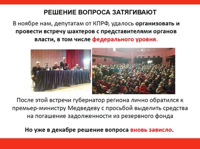 В ноябре нам, депутатам от КПРФ, удалось организовать и провести встречу шахтеров с представителями органов власти, в том числе федерального уровня. Тогда мы буквально вытащили проблему на самый верх – губернатор региона лично обратился к премьер-министру Медведеву с просьбой выделить средства на погашение задолженности из резервного фонда. Появилась надежда, что проблема будет решена до Нового года.