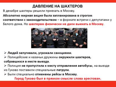 Сначала пытались просто запугать: ходили по домам тех, кто собирался приехать на встречу, угрожали санкциями. Перед самым выездом им уже напрямую препятствовали: полицейские и казачьи дружины окружили шахтеров, собравшихся в месте выезда. Наконец, полиция не пропустила к месту отправления автобусы, на транспортное предприятие было оказано давление. В довершение всего на выезде из Гуково поставили патрули, которые не должны были пропускать шахтеров в случае, если бы им все-таки удалось выехать. Были специально отменены рейсы в Москву. Город Гуково был в прямом смысле слова арестован.
