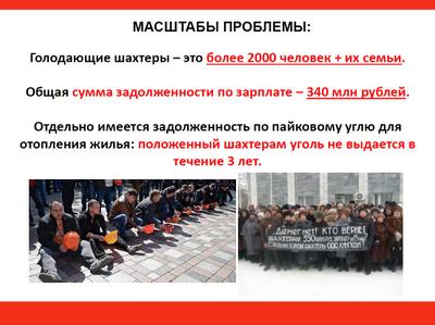 Один из излюбленных пиаровских приемов нынешней системы – сравнение с «лихими 90-ми»: мол, тогда было плохо, а сейчас хорошо. Но массовые долги по зарплатам и голодные шахтеры – это как раз оттуда, из 90-х. Давайте задумаемся – мы возвращаемся в 90-е? Я вовсе не сгущаю краски – я хочу, чтобы мы с Вами сегодня приняли решения, которые позволят не довести страну до ситуации, какая была 20 лет назад.