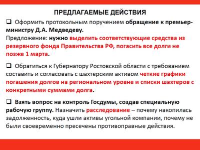 Я предлагаю конкретные практические действия: оформить протокольным поручением обращение к премьер-министру Медведеву с требованием незамедлительно дать ход его же собственным поручениям от 25 ноября и 5 декабря 2016 года – а именно на федеральном уровне решить проблему долгов перед шахтерами. Нужно выделить соответствующие средства из резервного фонда Правительства РФ – вот то предложение, которое я призываю Вас поддержать. Надо погасить все долги не позже 1 марта, иначе ситуация может выйти из под контроля.
