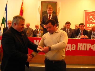 Не менее тепло зал приветствовал сообщение о награждении депутата фракции КПРФ в Государственной Думе ФС РФ А.Ж. Бифова Почетной грамотой Кабардино-Балкарской Республики за плодотворную общественно-политическую деятельность и большой вклад в социально-экономическое развитие республики.