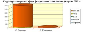 - Таким образом, в течение февраля 2019 года продолжилась информационная атака на «Красных губернаторов» (С. Левченко и В. Коновалова). Однако снизилось количество центральных федеральных каналов, принимающих в ней участие. Да и влиятельность телеканалов Рен ТВ и «Пятого», которые были главной ударной силой информ-атак, не очень высока.