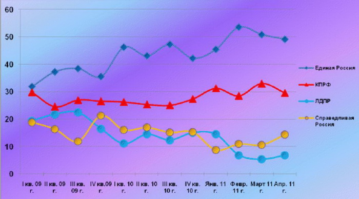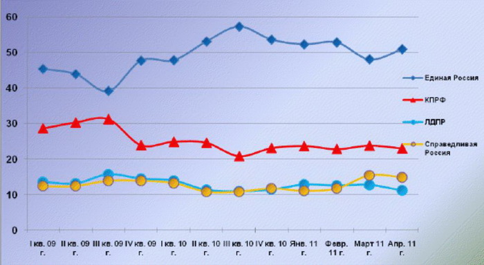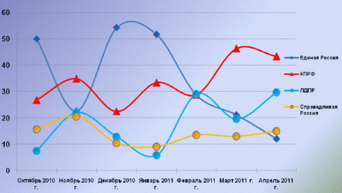 Результаты апреля 2011 года демонстрируют существенное снижение числа положительных высказываний о партии власти до 12% с январских 51,7% и позитивацию образа КПРФ до уровня 43,3% рейтинга (против 33,4% в начале года). Ощутима вариация индекса ЛДПР, в рассматриваемый период достигшего планки в 29,7% (против 5,8% в первом месяце текущего года). И лишь об «СР» наблюдается относительная стабильность числа одобрительных высказываний в информационном пространстве – 15%.