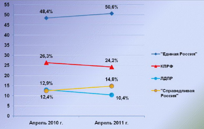Результаты апреля 2011 года фракционных составляющих парламентских политических сил в сравнении с предыдущим месяцем свидетельствуют о снижении показателей коммунистов (- 3,4% и 29,6%) и единороссов (- 1,7% и 49,2%) и росте активности эсеров (на 3,7% и 14,4%) и либерал-демократов (на 1,4% и 6,8%).