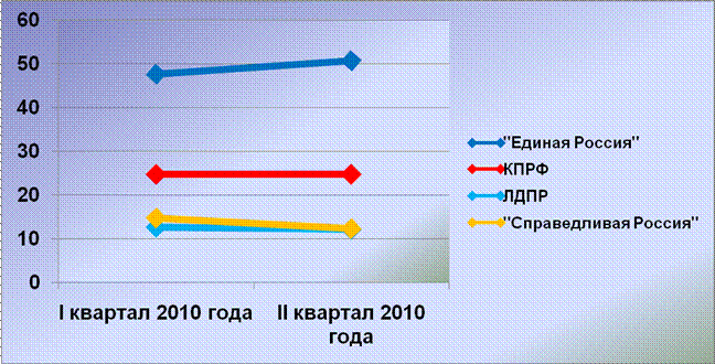 Ослабли позиции «Справедливой России»: 10,9% – за II квартал 2010 года вместо 13,3% кварталом ранее, что не позволило ей взять верх над ЛДПР в «борьбе» за статус третьей силы в информационном потоке по партийному критерию, несмотря на снижение показателей жириновцев – 11,4% против 14% за январь – март 2010 года.