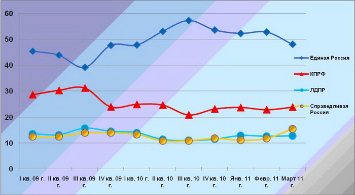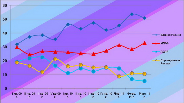 Март 2011 года ознаменовался падением информационных индексов «Единой России» с 52,8 в предыдущем месяце до 48%, что в среднем за I квартал 2011 года принесло ей 50,4%. Освободившееся пространство информационного поля было распределено между остальными парламентскими партиями, продемонстрировавшими небольшой рост показателей: «Справедливая Россия»на3,6% (с 11,8 до 15,4%) и первоквартальные 12,1%, КПРФна 1% (с 22,8 до 23,8%) и 23,5% по итогам января – марта, ЛДПР – на 0,2% (с 12,6 до 12,8%) и средние 14% за первые три месяца текущего года.