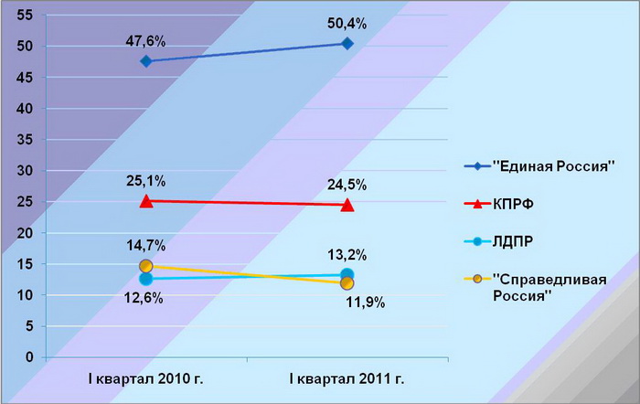 Тем же образом складывается ситуация и в отношении показателей I квартала 2010 и 2011 года: в «плюсе» единороссы (50,2% против прошлогодних 46,3%) и коммунисты (нынешние 31% вместо 26,3%), в «минус» ушли эсеры (10,3% в противовес 16,1% годом ранее) и либерал-демократы (8,5% в 2011 г. и 11,1% в 2010 г.).