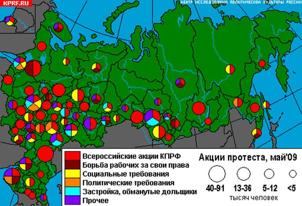 В целом же можно заметить, что наиболее широкий набор протестных требований характерен для двух столиц – Москвы и Санкт-Петербурга, а также Краснодарского края, Ростовской, Белгородской, Новосибирской областей. Единственным исключением для Москвы и Санкт-Петербурга является отсутствие в мае сообщений о забастовках и выступлениях рабочих, что, видимо, объясняется тем, что в столичных мегаполисах практически ликвидировано крупное промышленное производство с высокой занятостью работников.