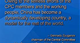 На просьбу дать оценку роли КПК в развитии теории и практики международного коммунистического движения Г.А. Зюганов подчеркнул тот факт, что сегодня Китай вносит определяющий вклад в мировое движение за социализм и является локомотивом всемирно-исторического прогресса. Своими грандиозными успехами Пекин демонстрирует преимущества социалистического пути развития всему миру. Некогда бедная аграрная страна, раздираемая внутренней враждой и разоряемая иностранными захватчиками, превратилась в ведущую державу планеты. Под руководством КПК она бросает вызов традиционным центрам глобального влияния в лице США и Западной Европы.