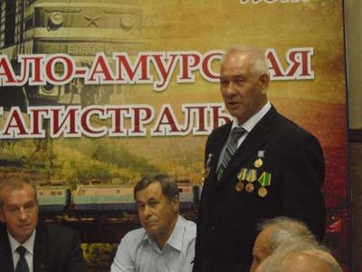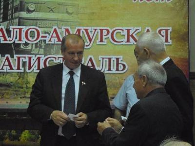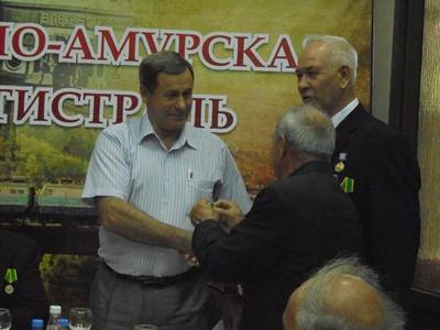 С ответным словом выступил председатель Союза первопроходцев БАМа Виктор Бочаров. Он вручил С.Левченко, Е.Рулькову, а также секретарям областного комитета КПРФ Владимиру Аксёнову и Владимиру Примачку памятные медали «К 40-летию БАМа».
