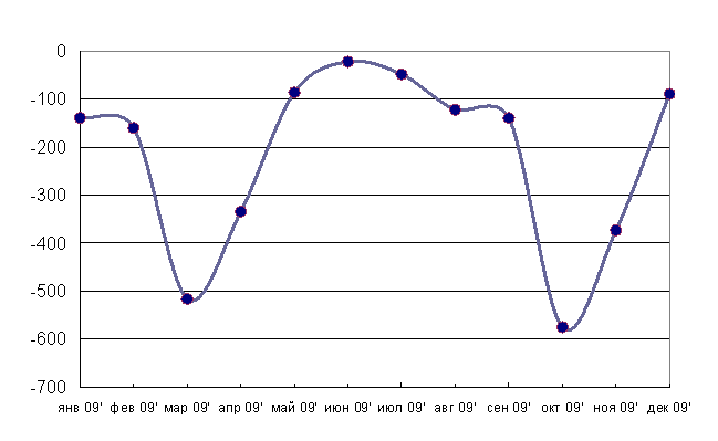 Минимальные значения индекса приходятся на март и октябрь 2009 года, а также – апрель и ноябрь. Максимальные – на период с мая по июль.