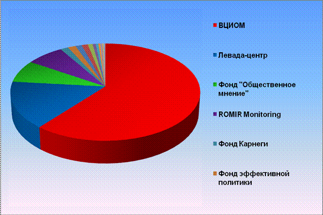 Как видно, в медиа-пространстве по количеству упоминаний в СМИ доминируют правительственный ВЦИОМ, независимый и близкий к праволиберальным силам Левада-центр и ориентированный на заказы Администрации президента – ФОМ.