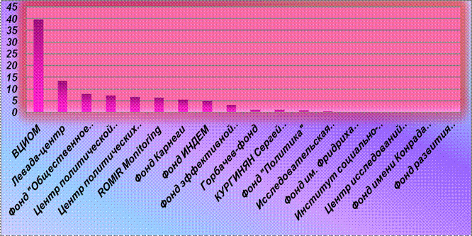 По активности воздействия на умонастроения общества и политического класса лидируют ВЦИОМ, Левада-центр, Фонд "Общественное мнение", ROMIR Monitoring (табл.3). На их долю приходится более 90 проц. от общего объема содержательных публикаций о результатах научной и экспертной деятельности.