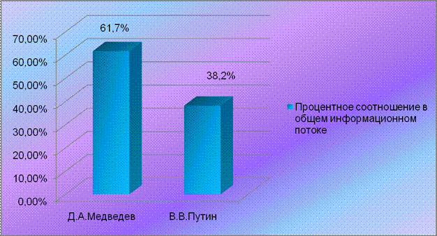 Согласно итоговым показателям телевизионного информационного потока, отведенного СМИ главам властного тандема, представленность Д.Медведева составила 61,7 %, В.Путина – 38,2 %.