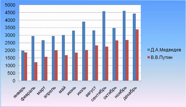 | Месяц 2009 года | Представленность в СМИ Д.А.Медведева | Представленность в СМИ В.В.Путина |