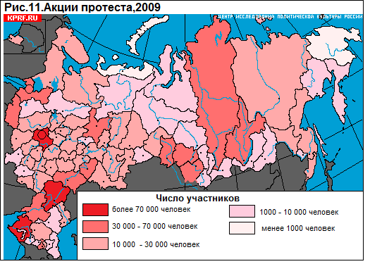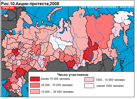 Так, если в 2008 году регионов, собравших на протестные акции более 7 тысяч человек, было 7, в 2009 году их количество уменьшилось до 4.