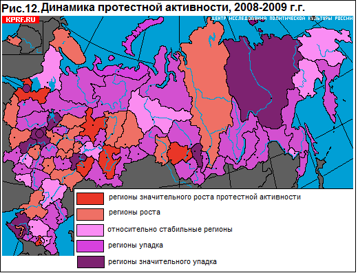 Рост протестной активности в 2009 году продолжали показывать либо крупные промышленные регионы, специализирующиеся на экспортных отраслях (черная и цветная металлургия, лесная промышленность, химическая промышленность и проч.) - Красноярский край, Пермский край, Свердловская область, Челябинская и Ростовская области, либо регионы с ярко развитой промышленностью, в том числе, оборонной – Самарская, Смоленская, Нижегородская области и др. – т.е. регионы, первыми попавшие под удар кризиса.