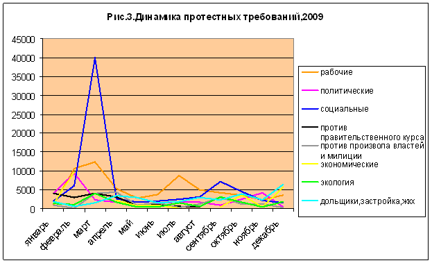 Стоит также отметить, что для начала 2009 года был характерен значительный рост показателей протестной активности, в том числе, выступлений рабочих (рис.1,3).