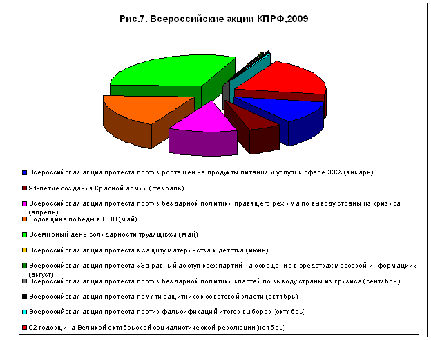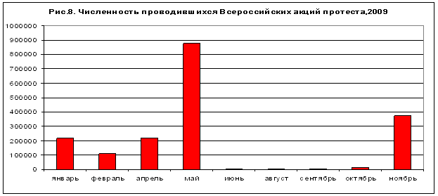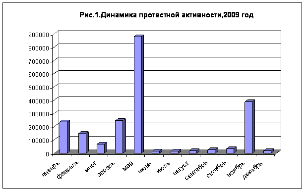 За 2009 год в протестных действиях, включая голодовки, приняло участие более двух миллионов человек. В целом, это находится на уровне показателей 2008 года, хотя и немного уступает им (2 млн. 110 тыс. человек против 2 млн. 470 тыс. соответственно). Наиболее «пиковыми» периодами, как и в прошлом году, были май и ноябрь, на которые приходятся главные акции КПРФ – Международный день солидарности трудящихся, празднование дня Победы в Великой отечественной войне и годовщина Великой Октябрьской социалистической революции (рис.1,2).