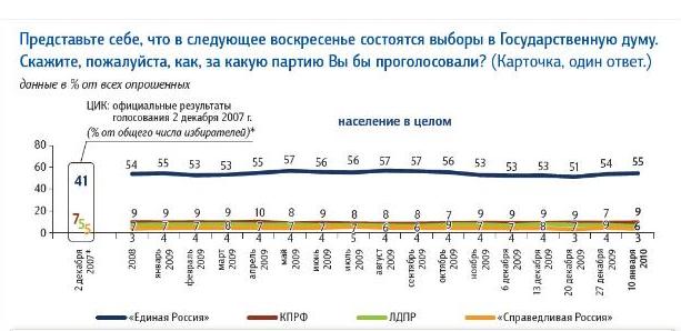 В целом средний опросный показатель электоральный поддержки на конец 2009 года: «Единая Россия» - 55 процентов, КПРФ – 8, ЛДПР – 5, «Справедливая Россия» - 3.