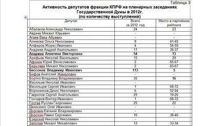 Поименный список членов фракции КПРФ, внесших свой вклад в законодательный процесс в 2012 года представлен в таблице 3.