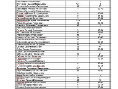 В десятку наиболее активных вошли депутаты: Коломейцев Н.В. (313), Локоть А.Е. (179), Плетнева Т.В. (121), Решульский С.Н. (119), Бессонов В.И. (113), Федоткин В.Н. (107), Романов В.С. (90), Кашин В.И. (81), Кашин Б.С. (73), Штогрин С.И. (62), Смолин О.Н. (60).