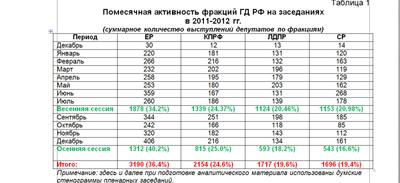 Отделом по информационно-аналитической работе и проведению выборных кампаний подготовлен анализ (по материалам стенограмм заседания Государственной Думы Федерального Собрания Российской Федерации) активности депутатов на парламентских заседаниях в целом за весеннюю и осеннюю сессию 2012 года.