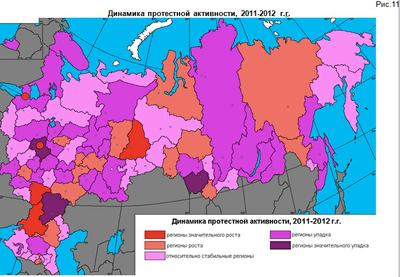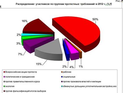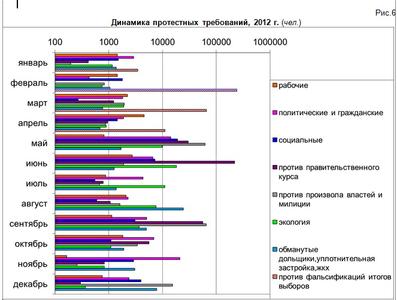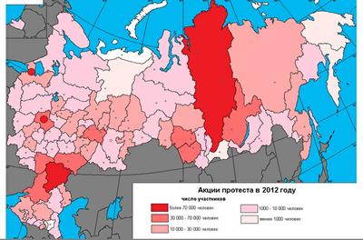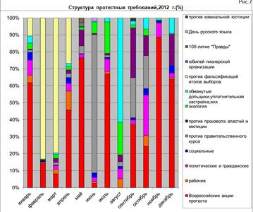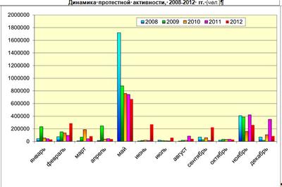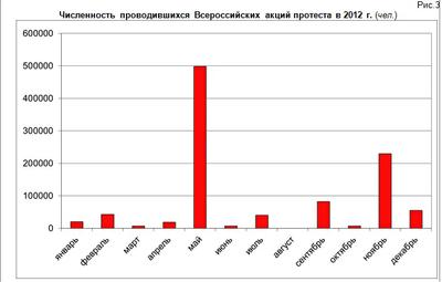 В 2012 году в различного рода протестных мероприятиях приняло участие более 2 млн. человек. Уровень протестной активности хотя и выше уровней предыдущих лет наблюдения, но все же не достиг максимума 2008 года. Как и в прошлые годы, пиковыми периодами объяснимо стали май и ноябрь, на которые на которые приходятся крупнейшие всероссийские акции КПРФ – Всемирный день солидарности трудящихся, празднование дня Победы в Великой Отечественной войне и годовщина Великой Октябрьской Социалистической революции. Кроме того, значительный рост протестной активности, не характерной для прошлых лет, наблюдался в феврале, июне и сентябре и был связан с проведением крупных акций против нечестных выборов, правительственного курса и роста тарифов на услуги ЖКХ.