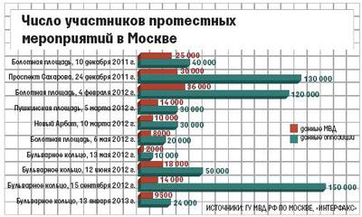 Как видно, расхождения данных организаторов и данных МВД, как и в случае с акциями КПРФ, составляет от двух до четырех-пяти раз.
