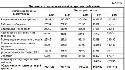 - В 2012 году наблюдался рост протестной активности населения. Так, в рассматриваемый период в акциях протеста, учитываемых в данном мониторинге по данным СМИ, приняло участие более 2 млн. человек, что выше показателей последних трех лет, но все же ниже максимума 2008 года.