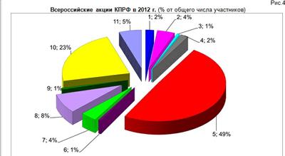 Наибольшее количество участников собрали празднования Международного Дня солидарности трудящихся и Победы в Великой отечественной войне, а также 95-й годовщины Великой октябрьской социалистической революции. На митинги и пикеты в рамках этих акций вышло около 800 тысяч человек. Массовыми также стали выступления в рамках акции против роста тарифов и цен на услуги ЖКХ, проведенной в сентябре (около 82 тысяч участников), в защиту образования, проведенной в декабре (54 тысячи участников), годовщины образования Советской армии (февраль, 43 тыс. чел.) и против вступления России в ВТО (июль, 40 тыс. чел.) (рис.3,4).