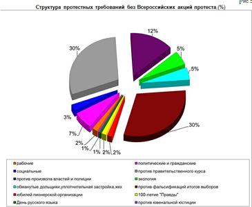 Как и годами ранее, в структуре протестных требований (по числу участников) на первом месте находятся Всероссийские акции протеста (рис.2, табл.1). В них приняло участие 50% всех участников. И в относительных, и в абсолютных показателях это ниже, чем в прошлые годы. Кроме того, можно говорить о продолжающемся серьезном росте протестной активности населения в борьбе с чиновничьим произволом и несогласием с социально-экономическим курсом правительства.