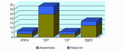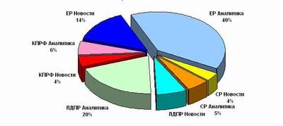 Итак, наибольшую часть общего синхрона занимает участие в аналитических передачах представителей «Единой России» (40%) и ЛДПРовцев (20%). Однако, несмотря на это, данные партии обгоняют КПРФ и «СР» и в новостных передачах. Т.е. Коммунистам и «справедливороссам», как в аналитических, так и в новостных выпусках внимание уделяется на минимальном уровне.