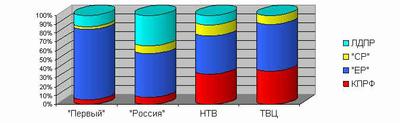 Коммунисты получили наилучшие результаты на ТВЦ (38%) и НТВ. Однако, стоит учесть, что «Постскриптум» на ТВЦ занял совсем мало эфирного времени, а «Список Норкина» на НТВ выходил в эфир лишь 3 раза.