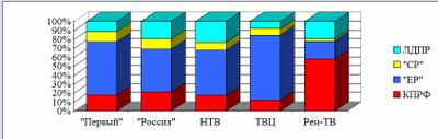 Максимальную долю эфирного времени КПРФ получила на Рен-ТВ, (58%). Минимальную – на ТВЦ (12%).