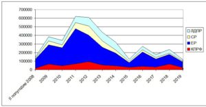 Как видим, наибольший объем новостного партийно-политического телеэфира на пяти федеральных каналах был зафиксирован в 2011-2012 гг. В дальнейшем объемы освещения деятельности политпартий неуклонно сокращались. Даже в годы парламентских (2016 г.) и президентских выборов (2018 г.) информации о деятиельности партий было в два раза меньше, чем в 2011-2012 гг.