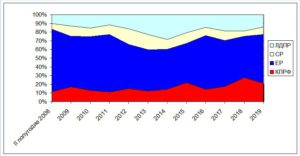 В течение июля 2008 г. – декабря 2019 г. структура партийного телеэфира менялась следующим образом (Гр. 1):