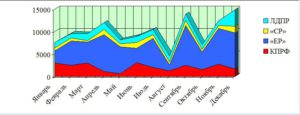 ЛДПР получала наибольший объём эфирного времени в августе (28%, подготовка к выборам) и декабре (25%, юбилей партии).