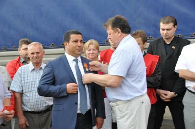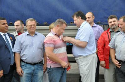 Завершая свое выступление, Владимир Иванович наградил партийными медалями «70 лет освобождению Крыма и Севастополя» директора ЗАО «Ступиноавтотранс» Александра Мосина (еженедельно выделяющего автотранспорт для доставки груза) и коммерческого директора ООО ПКФ «ГЮНАЙ» Араза Мурсалиева, который систематически вносит весомый вклад в формирование гуманитарных грузов для народа Новороссии, а также оказывает всяческую помощь и поддержку вынужденным переселенцам, проживающим в городе Домодедово.