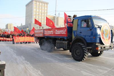 В Якутске состоялись демонстрация и митинг, посвященные 98-й годовщине Великой Октябрьской социалистической революции. Вначале недели в столице республики стояла необычно теплая для наших краев температура — минус 9 градусов, а 7 ноября резко похолодало аж до 28. Несмотря на резкую смену погоды, на праздничную демонстрацию и митинг пришло много народу, причем гораздо больше, чем в прошлые годы.