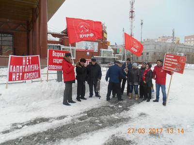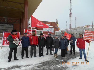 27 марта 2017 года под лозунгами «Долой ПЛАТОН – очередной побор с народа!», «Нет капитализма – нет кризиса!», «Нет росту цен и тарифов!» и «Возрождение социализма – спасение России!» новоуренгойские коммунисты провели на главной площади газовой столицы России у ГДК «Октябрь» массовый пикет в поддержку Всероссийской акции протеста, проводимой объединением перевозчиков России против системы «Платон».