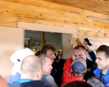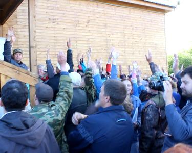 После приезда Е.Б.Волковой точно также началось закрытое заседание, но здесь народ, уже готовый к подобному, смог заставить его пропустить. Люди обступили главу поселения и скандировали «Позор!»
