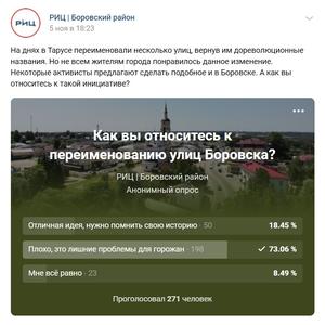 А в Боровске был проведён интернет-опрос об отношении горожан к возможному переименованию улиц. Там свыше 73% проголосовавших в группе «РИЦ Боровский район» высказались за сохранение нынешних названий улиц и лишь около 18,5% поддержали затею. Видимо, в городской Думе Боровска с результатами опроса ознакомились. Как отметил, обращаясь к коллегам, депутат от КПРФ Михаил Ерохин, в Боровске уже три поколения выросли на этих улицах, они для них привычные. Назови сейчас улицу старым названием, люди и не скажут, где она.