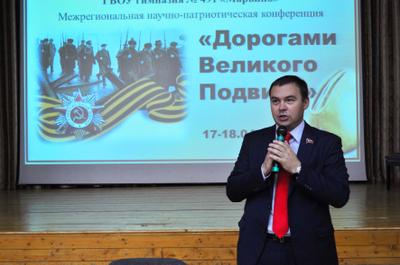 Юрий Афонин, член Президиума, секретарь ЦК КПРФ: «Программа нынешней научно-практической конференции, которая проходит в стенах вашей гимназии, даёт возможность обсудить очень серьёзные проблемы. Например, такие, как фальсификация истории. Сегодня мы видим, что, несмотря на серьёзную государственную политику, даже на территории Российской Федерации возникают такие попытки, не говоря уже о республиках бывшего СССР. Рассмотрим пример Украины. В чём главная проблема этой страны? В том, что на протяжении десятилетий через учебники, через государственную идеологию проводилась политика, которая была направлена на разобщение наших народов, ученикам давались совершенно ложные исторические знания, и в итоге это всё привело к тому хаосу, который сегодня происходит там. И мы с вами должны сделать всё, чтобы не допустить подобное на нашей земле».