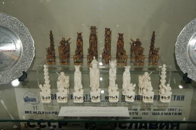 Но главное место в музее по праву занимают сами шахматы. Разнообразные, редкие, а иные – уникальные. Тонкой работы фигурки из слоновой кости – подарок Мао Цзедуна советскому врачу В.Х. Василенко в благодарность за излечение. Лаконичные картонные коробочки с нарисованными фигурами – шахматы блокадного Ленинграда. Бронзовые африканские маски – шахматы из Буркина-Фасо. Условные фигуры из гнутой проволоки – «гулаговские» шахматы. Шахматы, принадлежавшие Алехину и Нахимову. Один из самых интересных экспонатов – первые «космические» шахматы, специально разработанные инженером М.Клевцовым для игры в невесомости. На этой доске летом 1970 года космонавты А.Николаев и В.Севастьянов сыграли первую в истории человечества партию «Космос - Земля».