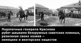 На совести казаков, пошедших в услужение к Гитлеру, – тысячи военных преступлений. Среди них, например, расправы с пленными. Наверно, всем интересующимся историей войны известны фотографии красновских казаков, которые рубят шашками безоружных советских пленных, демонстрируют свое мастерство кавалерийской рубки перед своими союзниками – германскими и венгерскими солдатами и офицерами. Немцы и венгры с одобрением смотрят, фотографируют. Также на счету гитлеровских казачков – борьба с партизанами, террор против гражданского населения, уничтожение белорусских деревень вместе с жителями, участие в подавлении Варшавского восстания. А заканчивалась их кровавая карьера весной 1945-го в Италии, где их преступления помнят до сих пор. За всем этим – генерал Краснов.