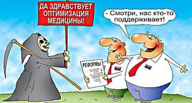 - Это далеко не первый пример внедрения «прогрессивных методов» в наше здравоохранение. Уже 20 с лишним лет продолжается так называемая «оптимизация» российской медицины. Оптимизация заключается главным образом в ликвидации медицинских учреждений: с 1990 года число больниц в России сократилось более чем вдвое! Также закрыто более 5 тысяч амбулаторий. В результате теперь и в большом городе попасть на прием к врачу-специалисту или лечь в больницу – задачи для человека с крепким здоровьем, а уж в селе – часто и вовсе не решаемая проблема. Порой единственный в округе ФАП находится в десятках километров, автобусов ходит мало (транспортную систему ведь тоже изрядно «оптимизировали»!). Родильные же отделения и в районных больницах позакрывали – приказ всем рожать в областном центре. Если успеют доехать, конечно.